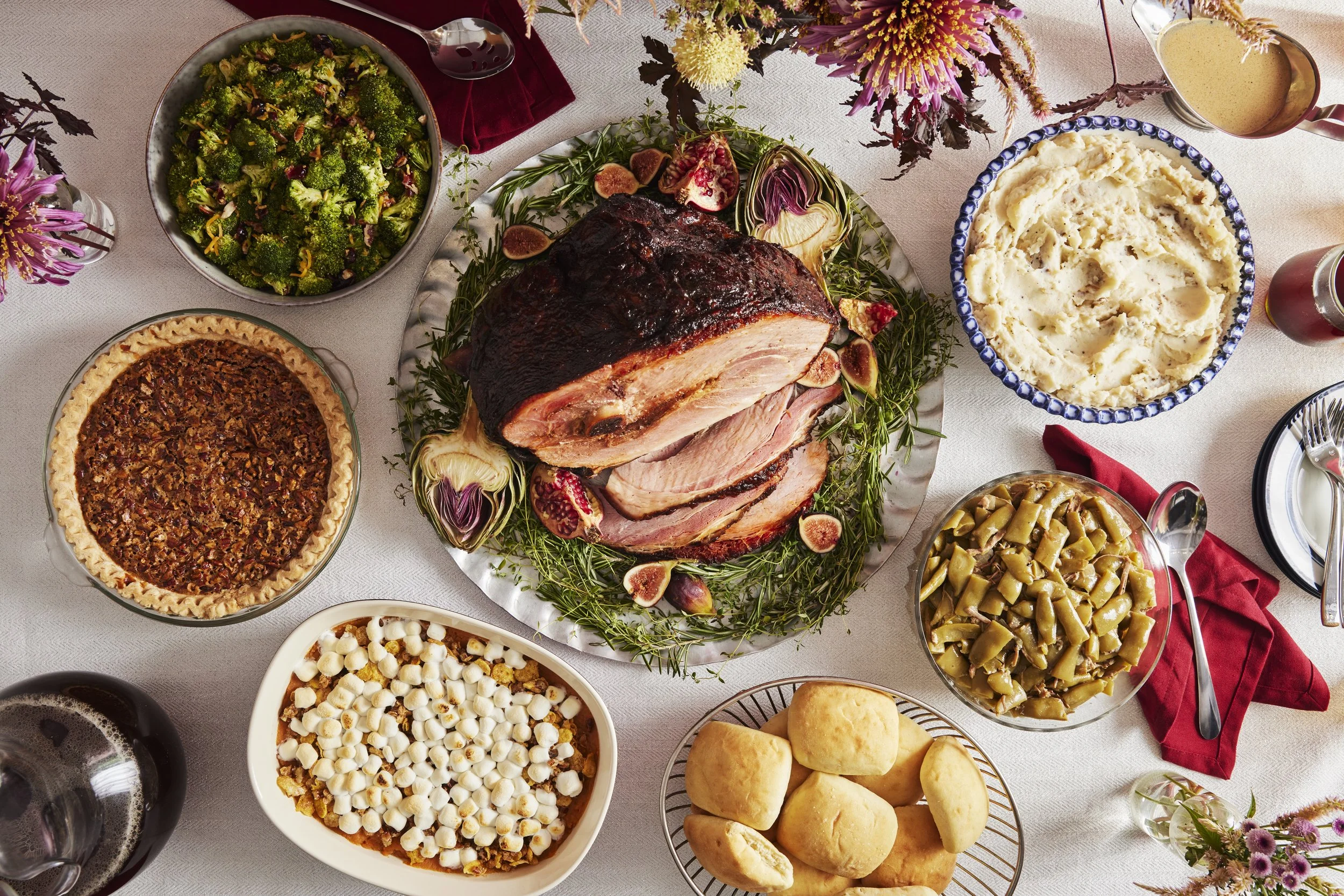 Ham comes with Mac & Cheese, Turnip Greens, Broccoli Salad, Gravy, and Hashbrown Casserole (1 quart each). Choice of BBQ Sauce (1 pint).